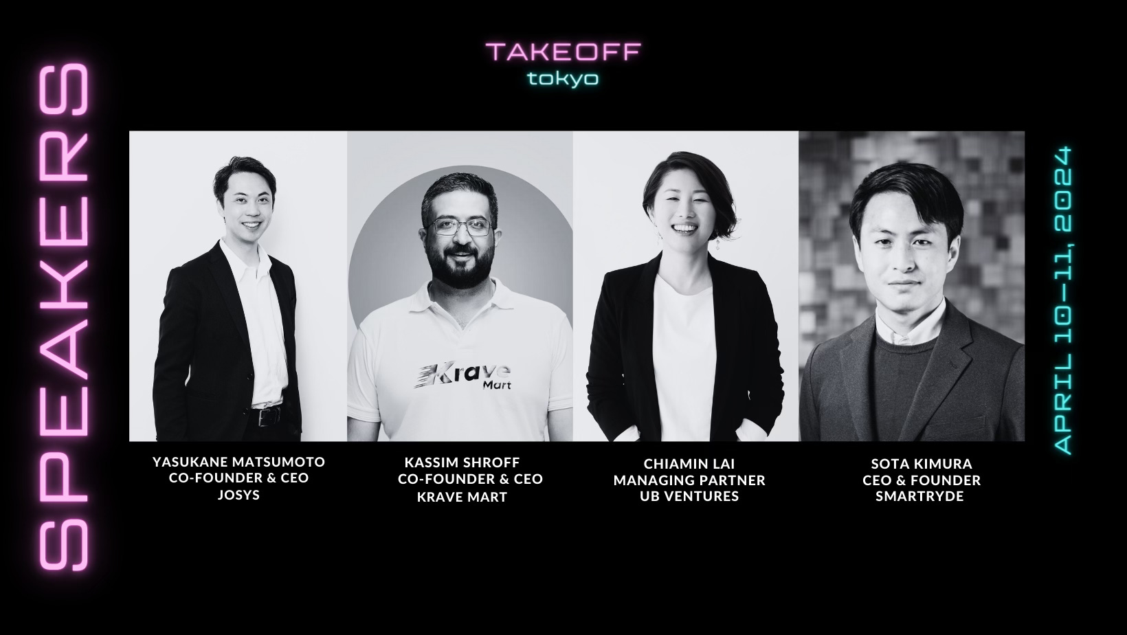 First speakers include Yasukane Matsumoto, Co-founder & CEO of Josys; Kassim Shroff, Co-founder & CEO of Krave Mart; Chiamin Lai, Managing Partner of UB Ventures and Sota Kimura, Co-founder & CEO of SmartRyde.